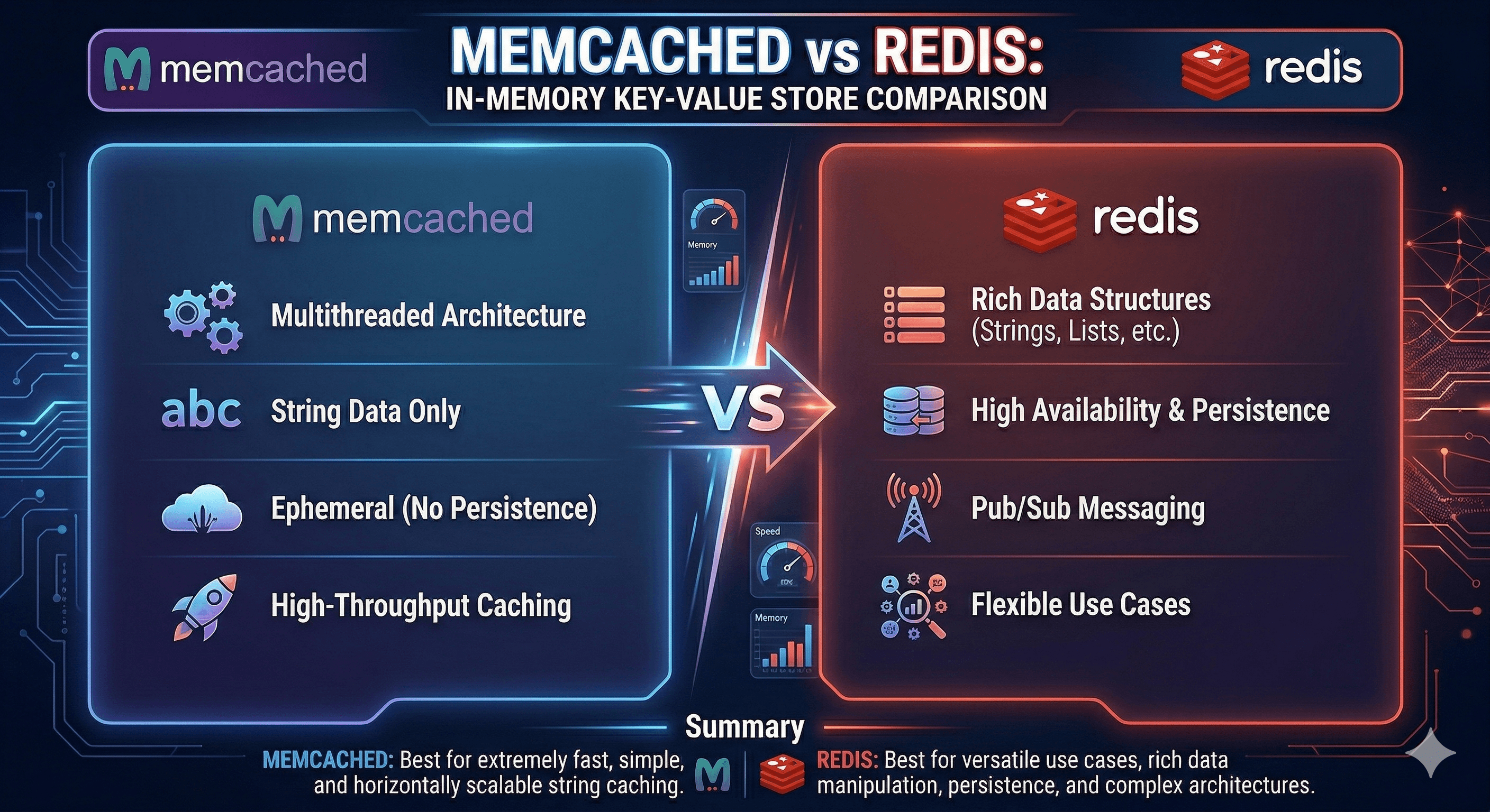 A common myth in the Memcached vs Redis comparison is that Redis is always faster. In reality, while Redis is incredibly fast, it is primarily single-threaded (though recent versions have introduced multi-threaded I/O). This means a single "expensive" command can block the entire server. Memcached, being natively multi-threaded, is often more resilient to "noisy neighbor" patterns in multi-tenant environments.
