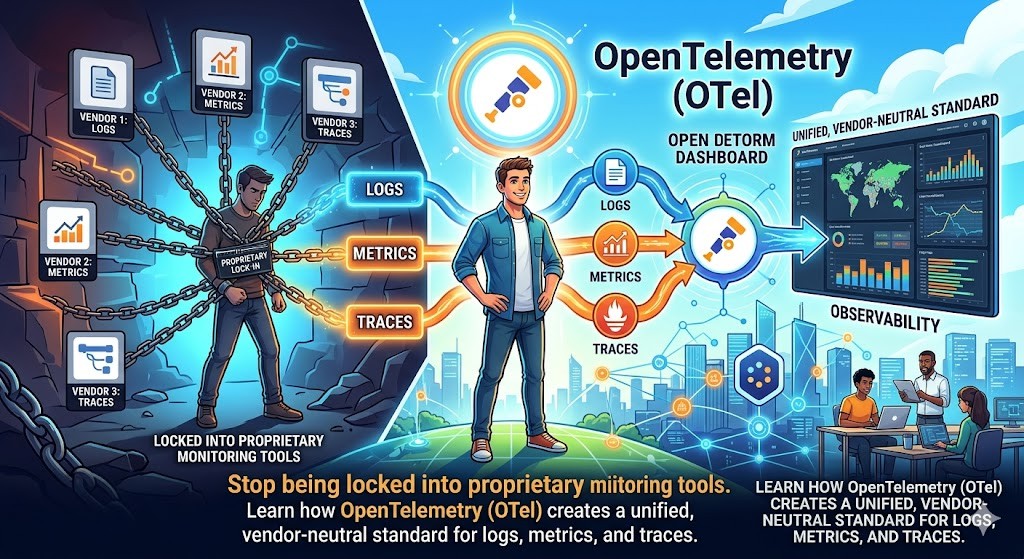 Stop being locked into proprietary monitoring tools. Learn how OpenTelemetry (OTel) creates a unified, vendor-neutral standard for logs, metrics, and traces.